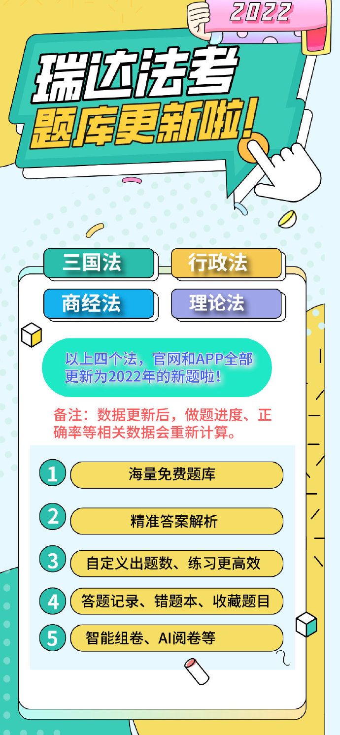 瑞達法考APP和瑞達法考官網(wǎng)中,三國法、行政法、商經(jīng)法、理論法,四個部門法都已更新為2022年新題。