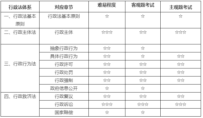 在2018年和2019年法考中,行政法學科客觀題考試分值約25分,主觀題考試是與商法二選一的選作題,分值約27分。