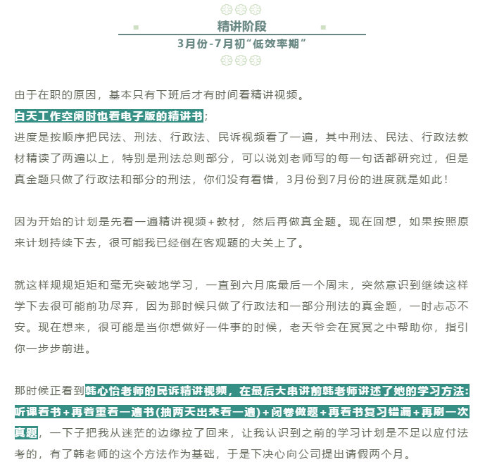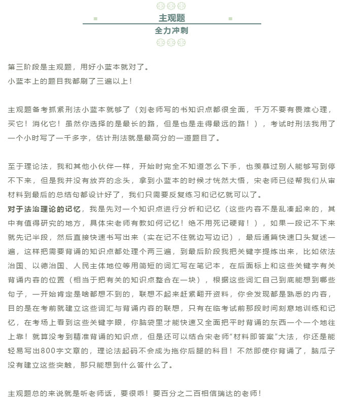 所謂基礎(chǔ)不牢地動(dòng)山搖,我認(rèn)為備戰(zhàn)法考沒有捷徑,該完成的還是要完成的,只能自己不斷優(yōu)化學(xué)習(xí)方法,爭取在最短時(shí)間內(nèi)拿下最多的知識(shí)點(diǎn)。