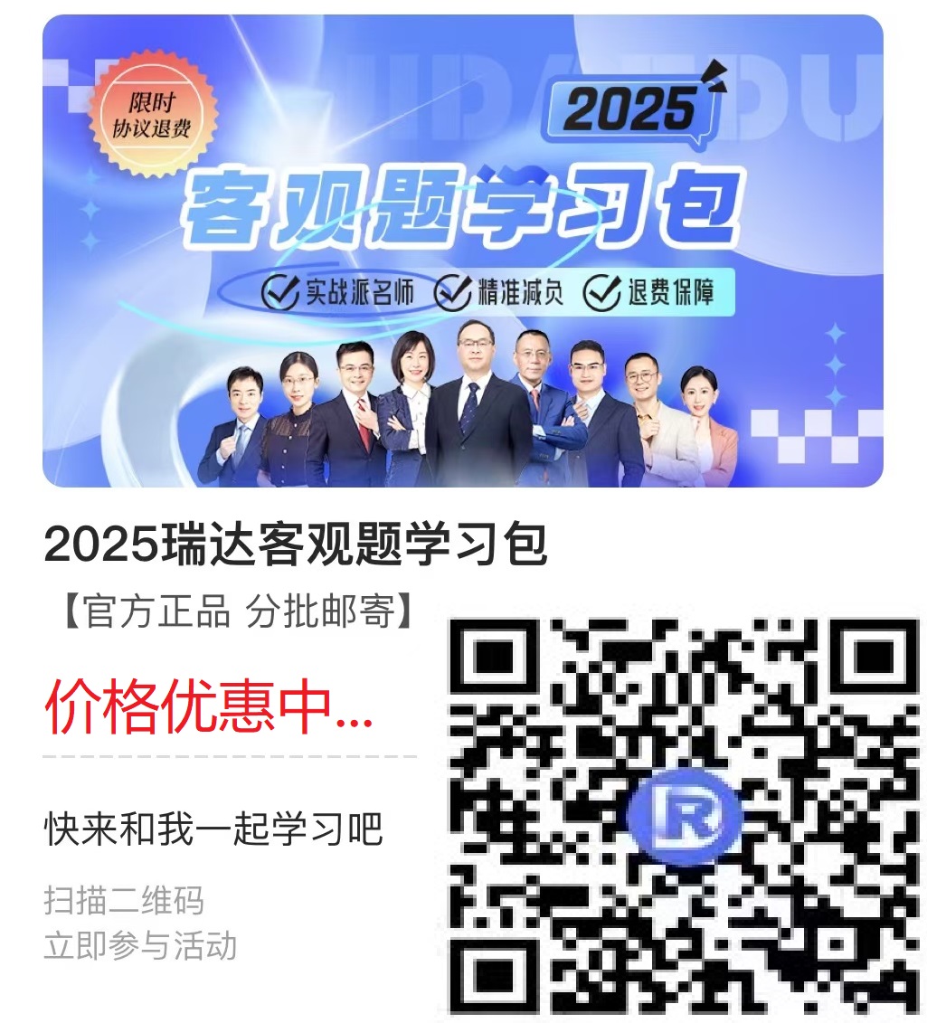 另外,在此提醒廣大瑞寶,一定要抓緊時間開始學習了!如果再拖延,小心后期的備考時間不夠用!建議購買25瑞達客觀題學習包,教材包含:基礎精講階段、真金題練習階段、精粹拔高階段、168模擬題階段。四個階段助力你輕松通過客觀題!