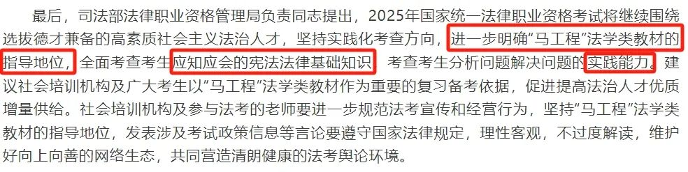 座談會還指出,在2025年國家統一法律職業資格考試中進一步明確“馬工程”法學類教材的指導地位,全面考查考生應知應會的憲法法律基礎知識,考查考生分析問題解決問題的實踐能力。