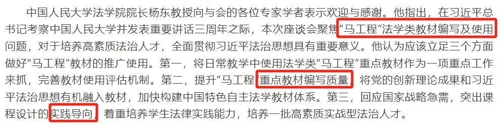 座談會目前還是聚焦“馬工程”法學類教材編寫及使用問題,也就是說,為了培養高素質實戰型法治人才,后期“馬工程”法學類教材還會進行重新的整合編寫,吸收實務部門專家一起參加撰寫,更注重教材的質量和實踐導向,同時縮短出版周期、2~3年為一個教材的修訂周期。
