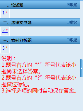 題號“*”表示該小題未作答,無“*”表示該小題已作答,“?”表示該小題被標(biāo)記。考生可以通過題號列表查看本考試科目全套試卷的作答情況(包括每道試題的已答或未答狀態(tài)),還可點(diǎn)擊各題號按鈕,直接進(jìn)入各試題進(jìn)行答題或檢查。